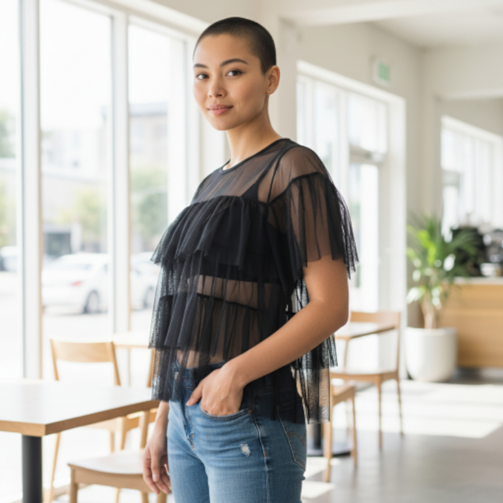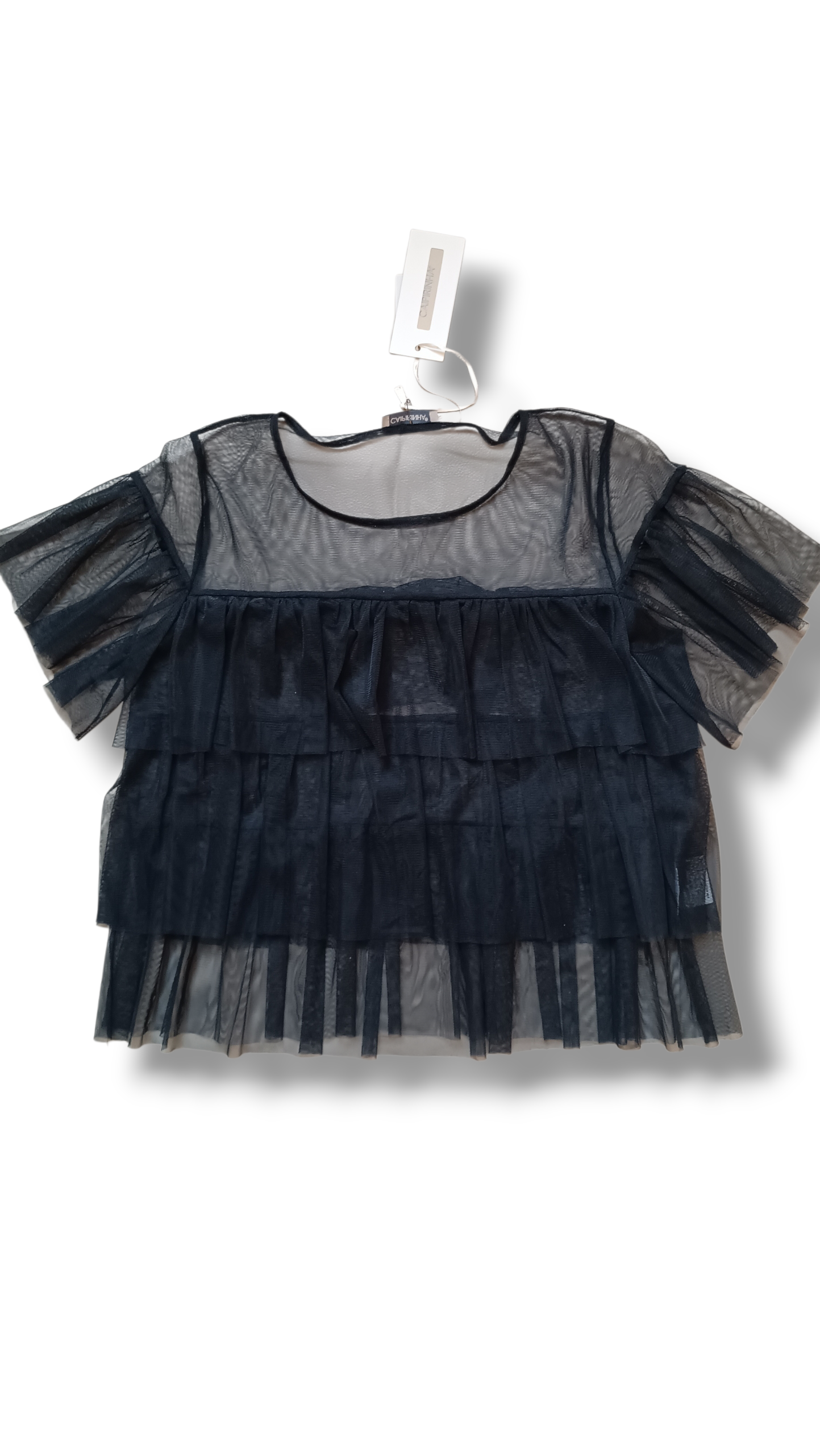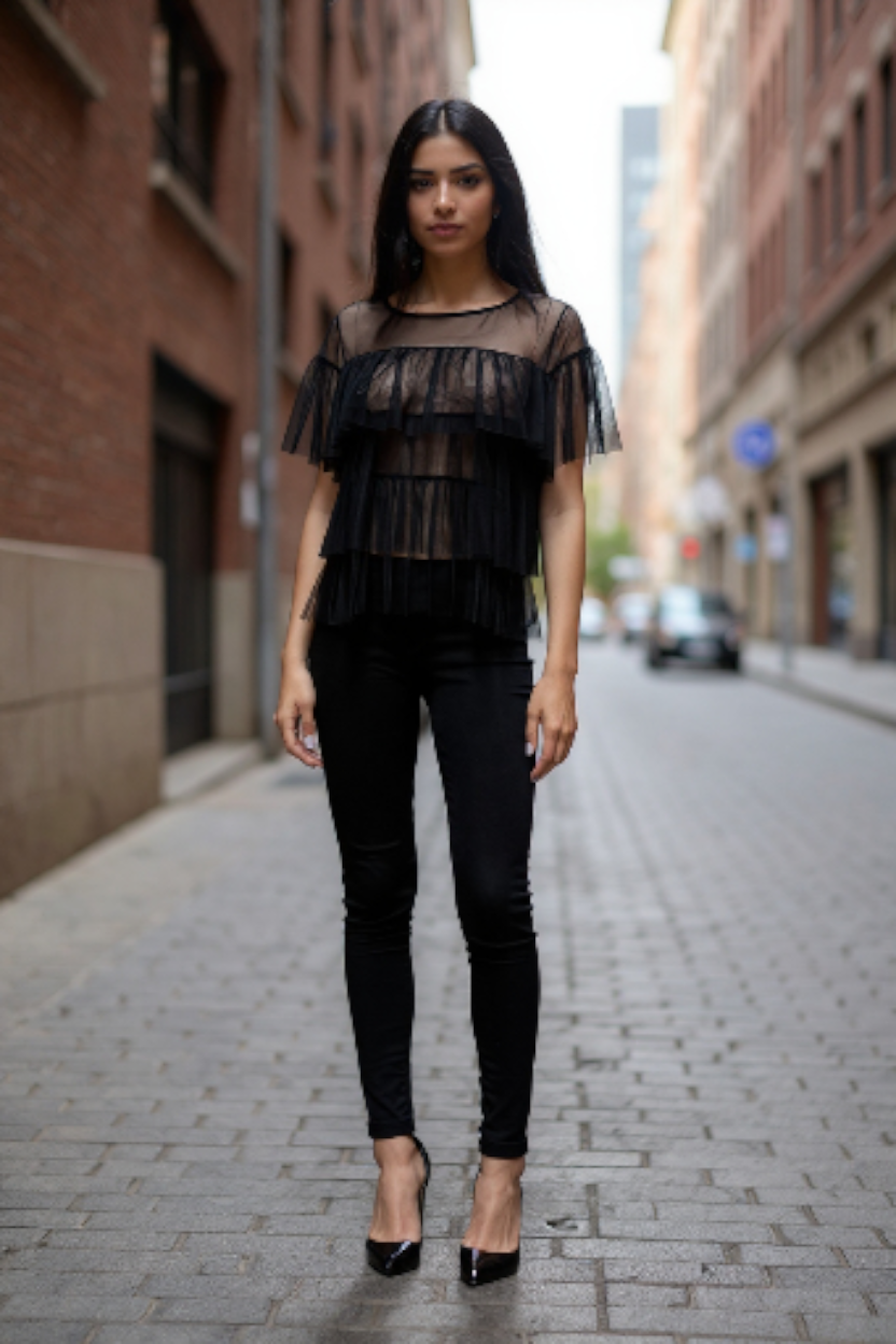 Este top es ideal para elevar un look básico y darle un toque glam. Su tul semitransparente aporta sensualidad sin perder elegancia, convirtiéndose en una prenda versátil para fiestas, cenas o eventos. Se adapta fácilmente a distintas combinaciones y es perfecto para quienes buscan estilo con un toque moderno y femenino.