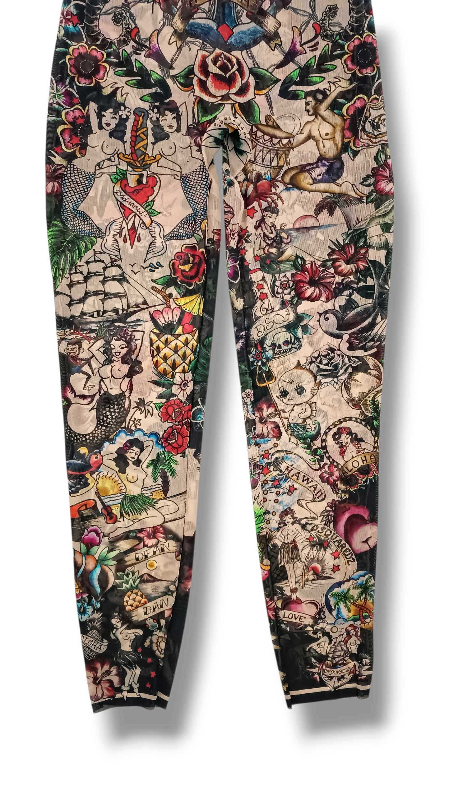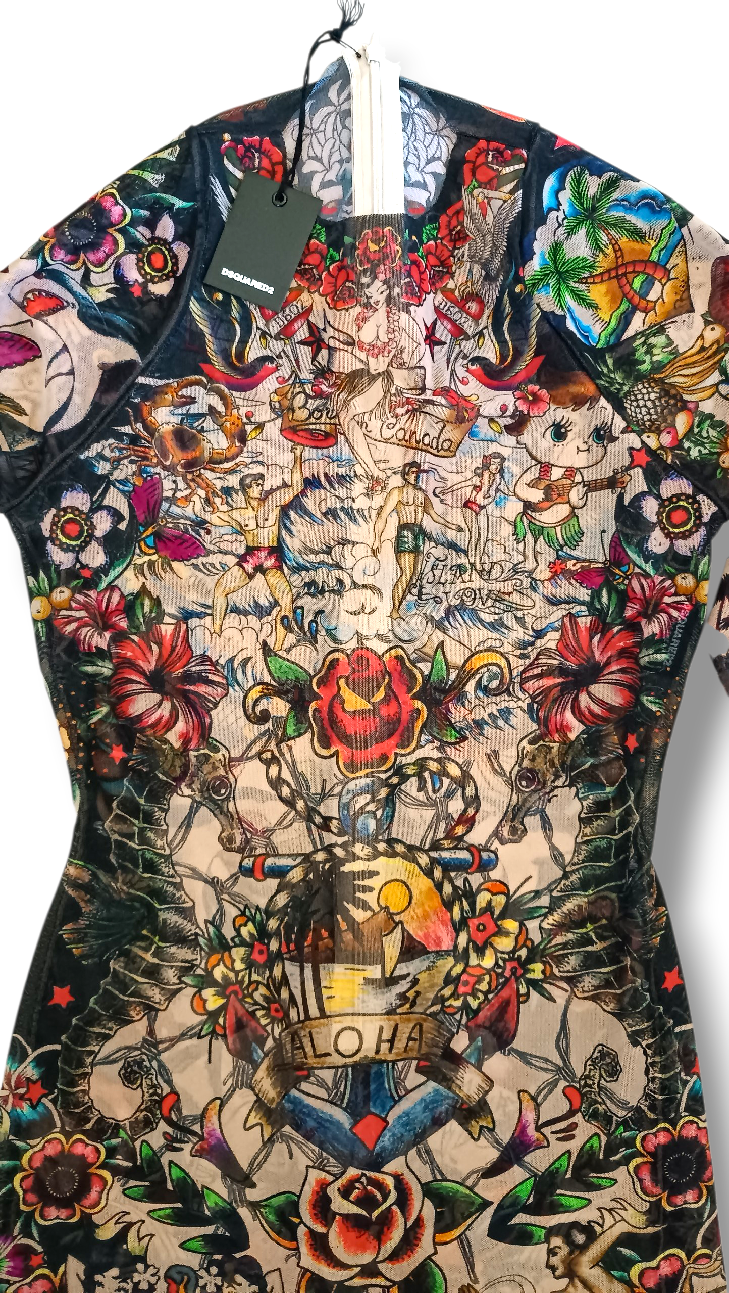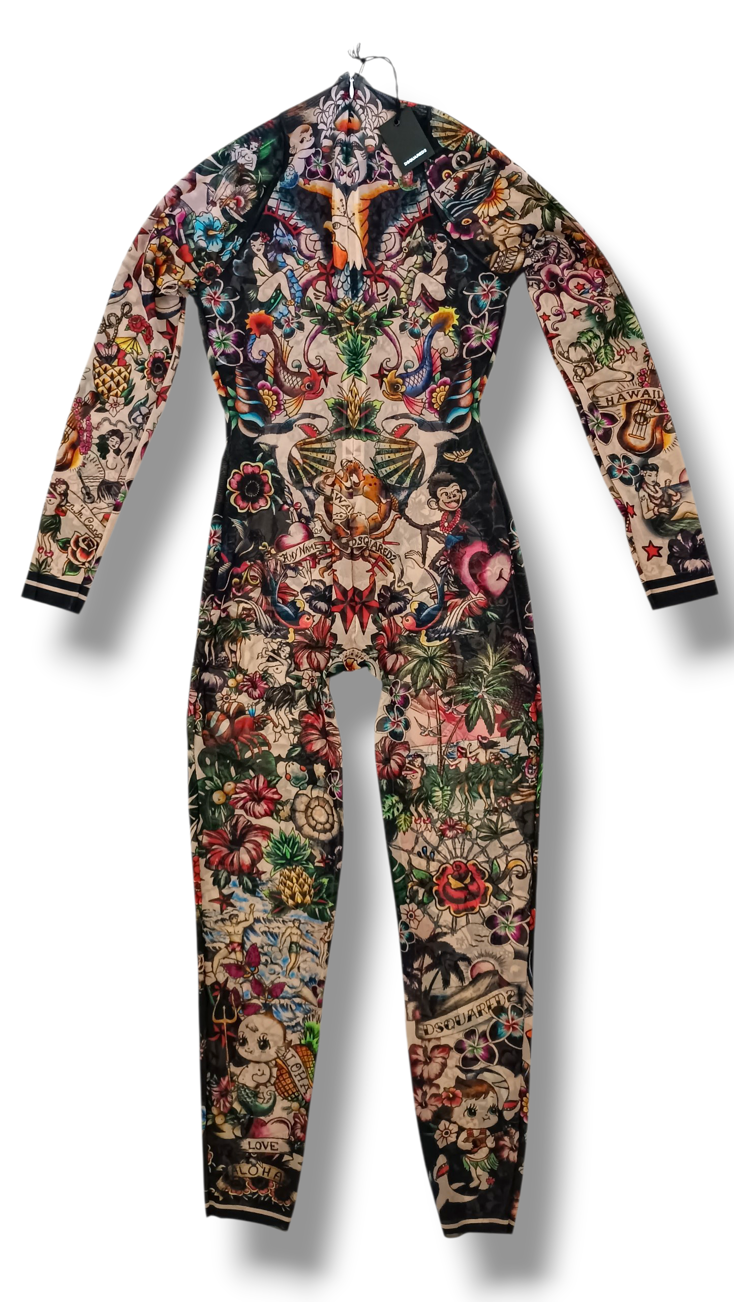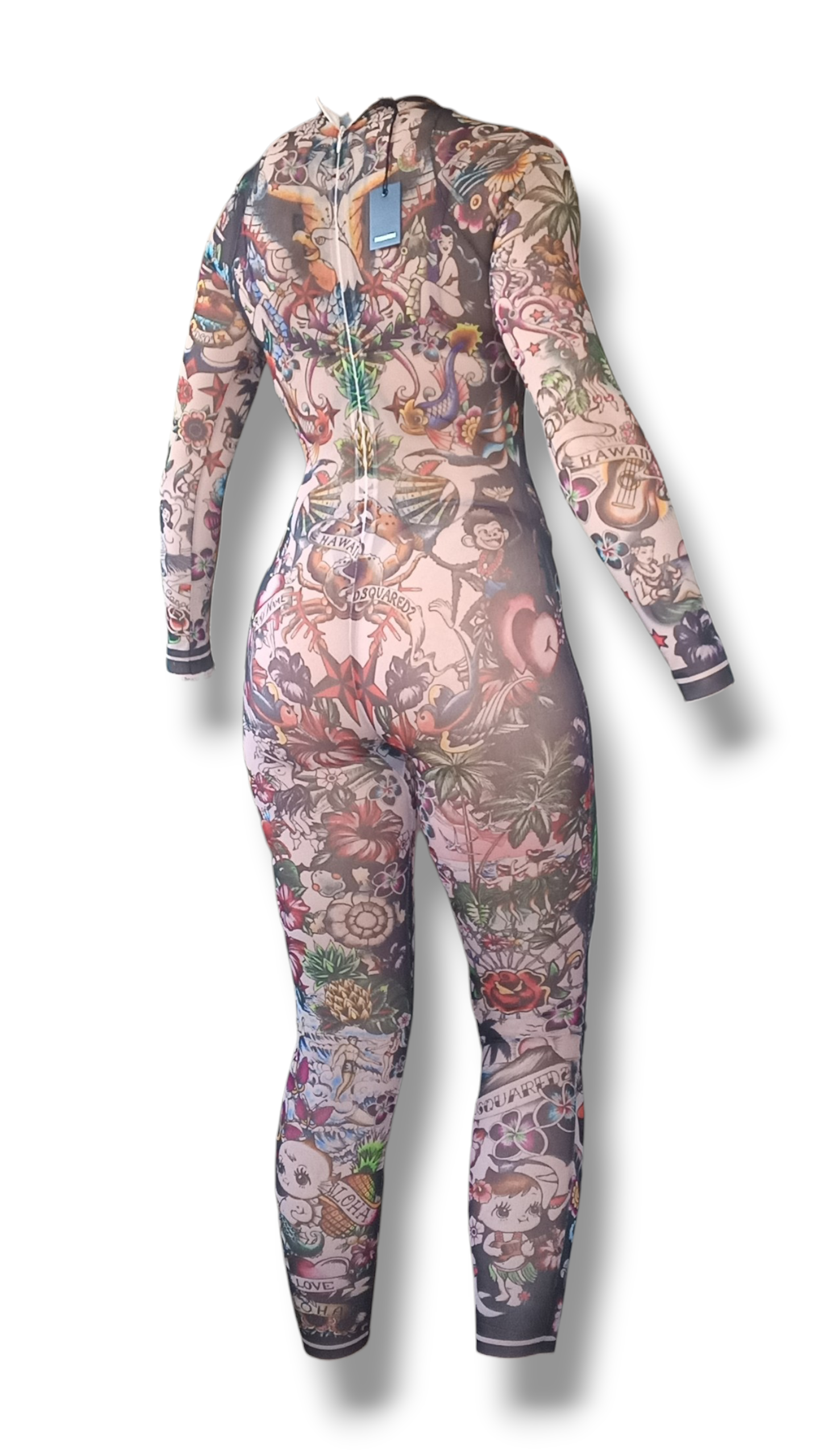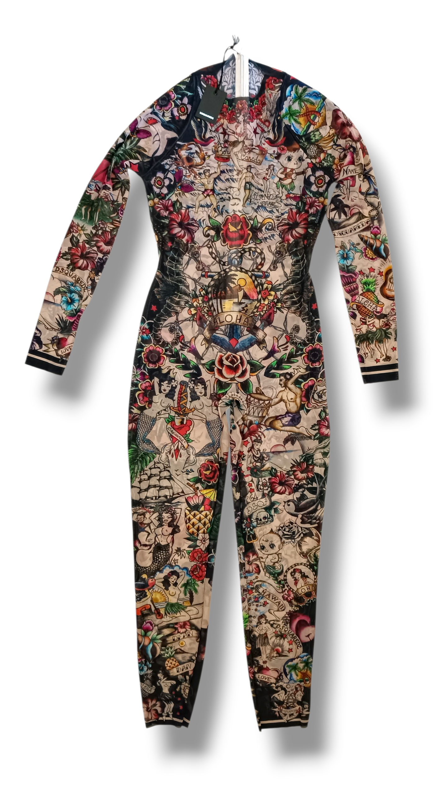 Mono jumpsuit transparente de DSQUARED2 con originales motivos de tatuajes, diseñado para crear un espectacular efecto visual sobre la piel. Una prenda única que simula llevar tatuajes por todo el cuerpo, perfecta para looks atrevidos, creativos y llenos de personalidad.