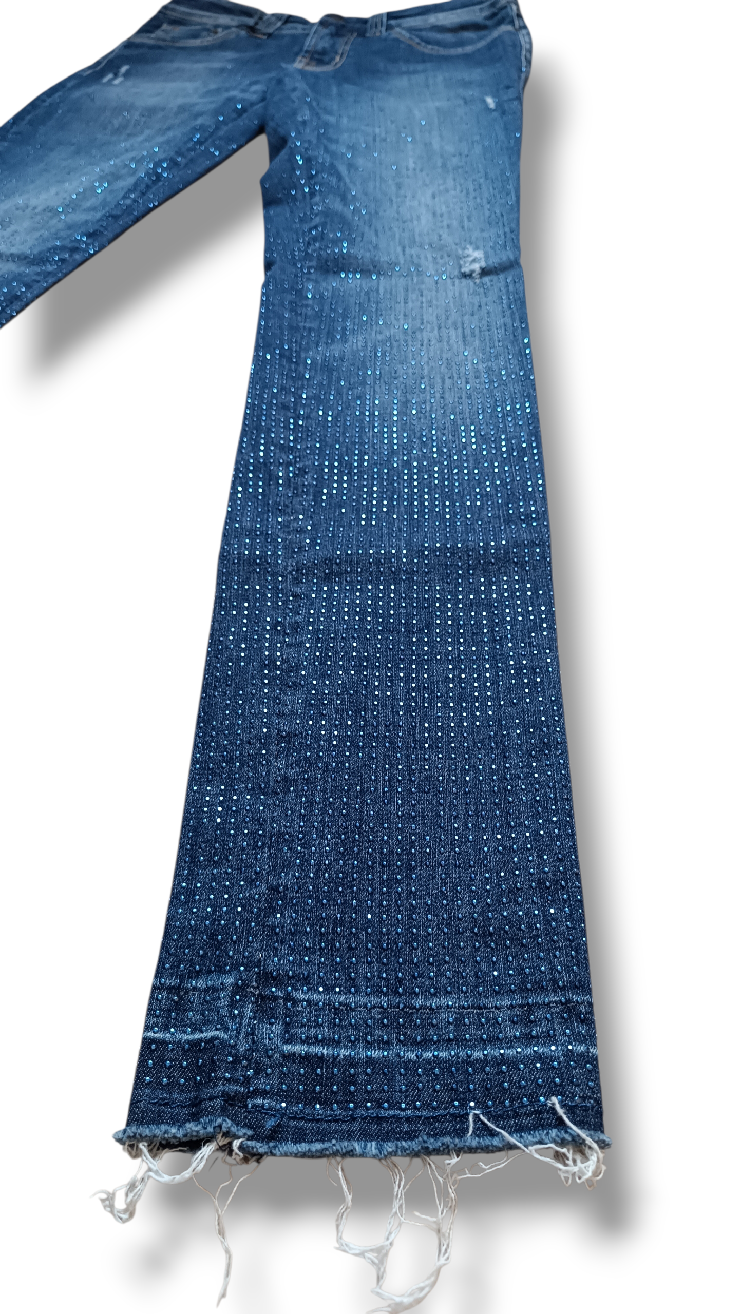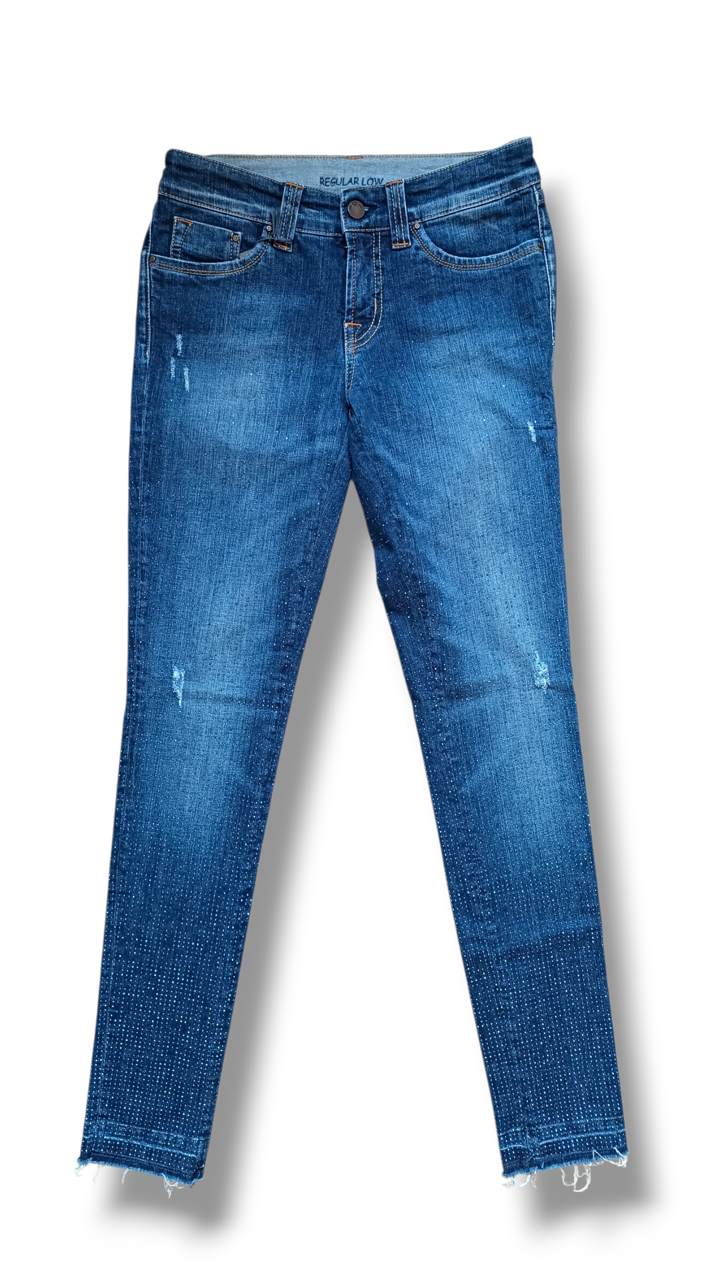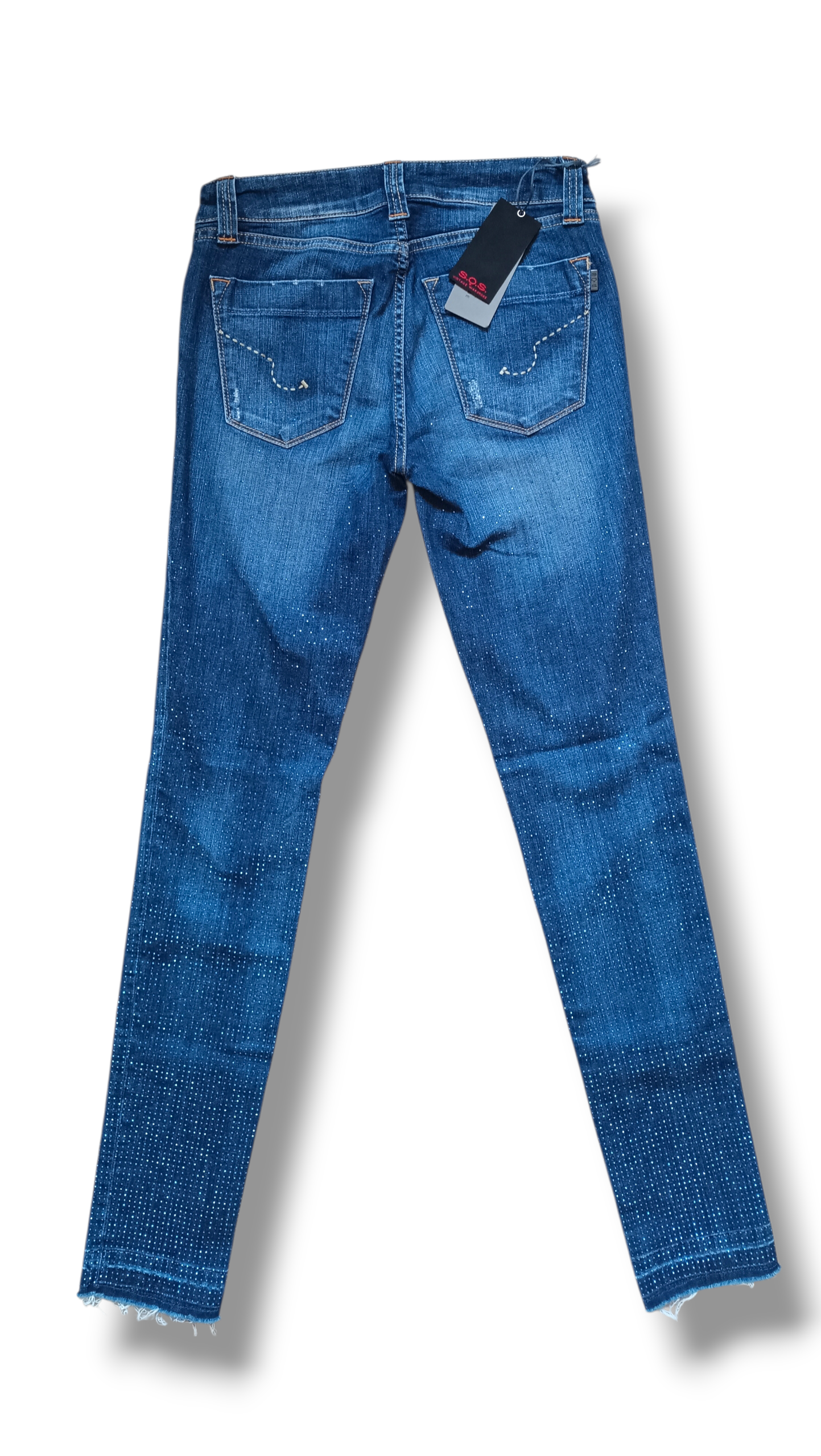 Un denim que combina comodidad, brillo sutil y estilo italiano. Este pantalón vaquero de SOS by Orza Studio está fabricado en denim stretch con microtachuelas azuladas que aportan un efecto brillante elegante sin resultar excesivo. Cuenta con 5 trabillas, cierre clásico de botón y cremallera, dos bolsillos traseros y tres delanteros, y un bajo efecto descosido que le da un toque urbano moderno.