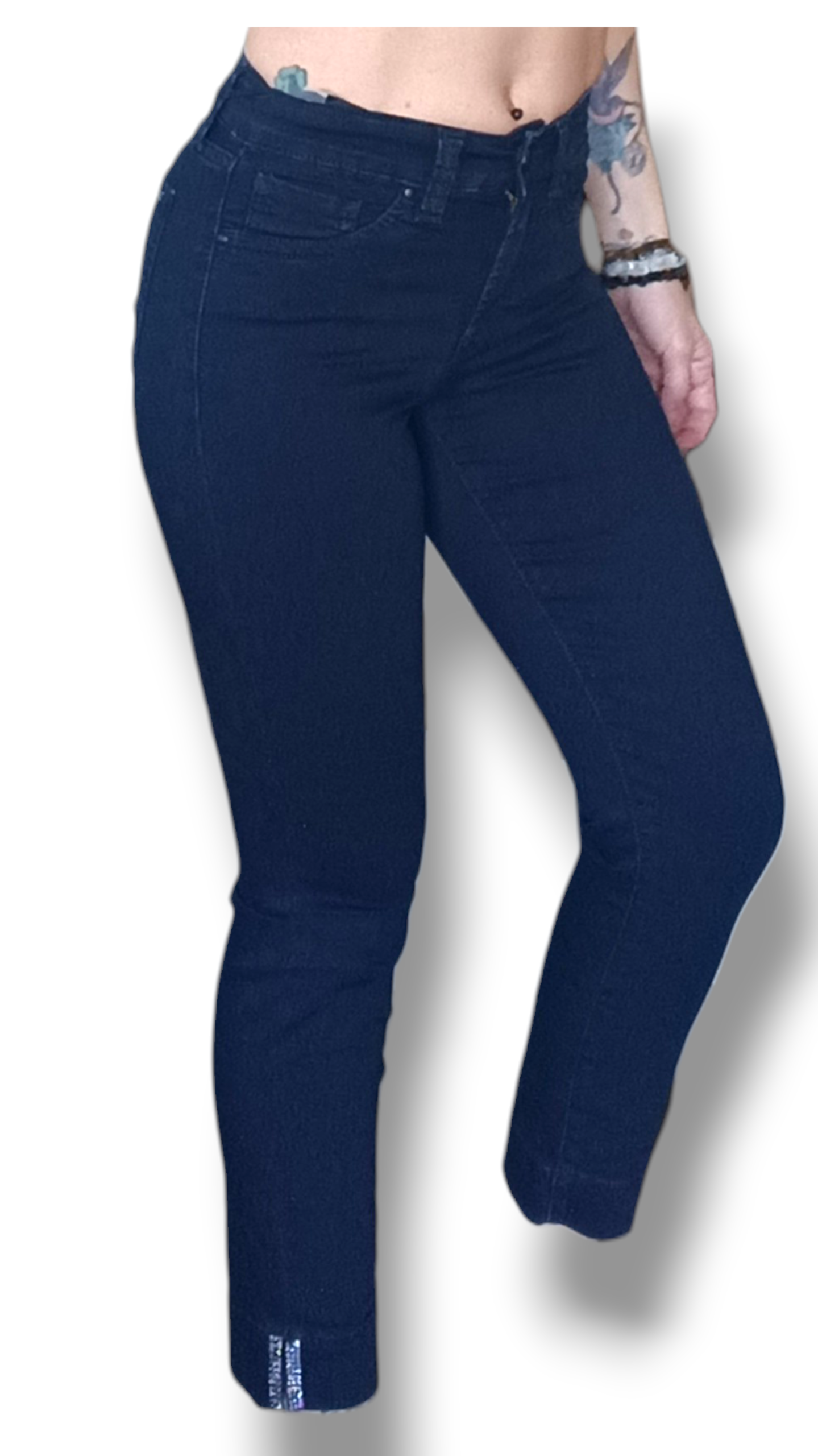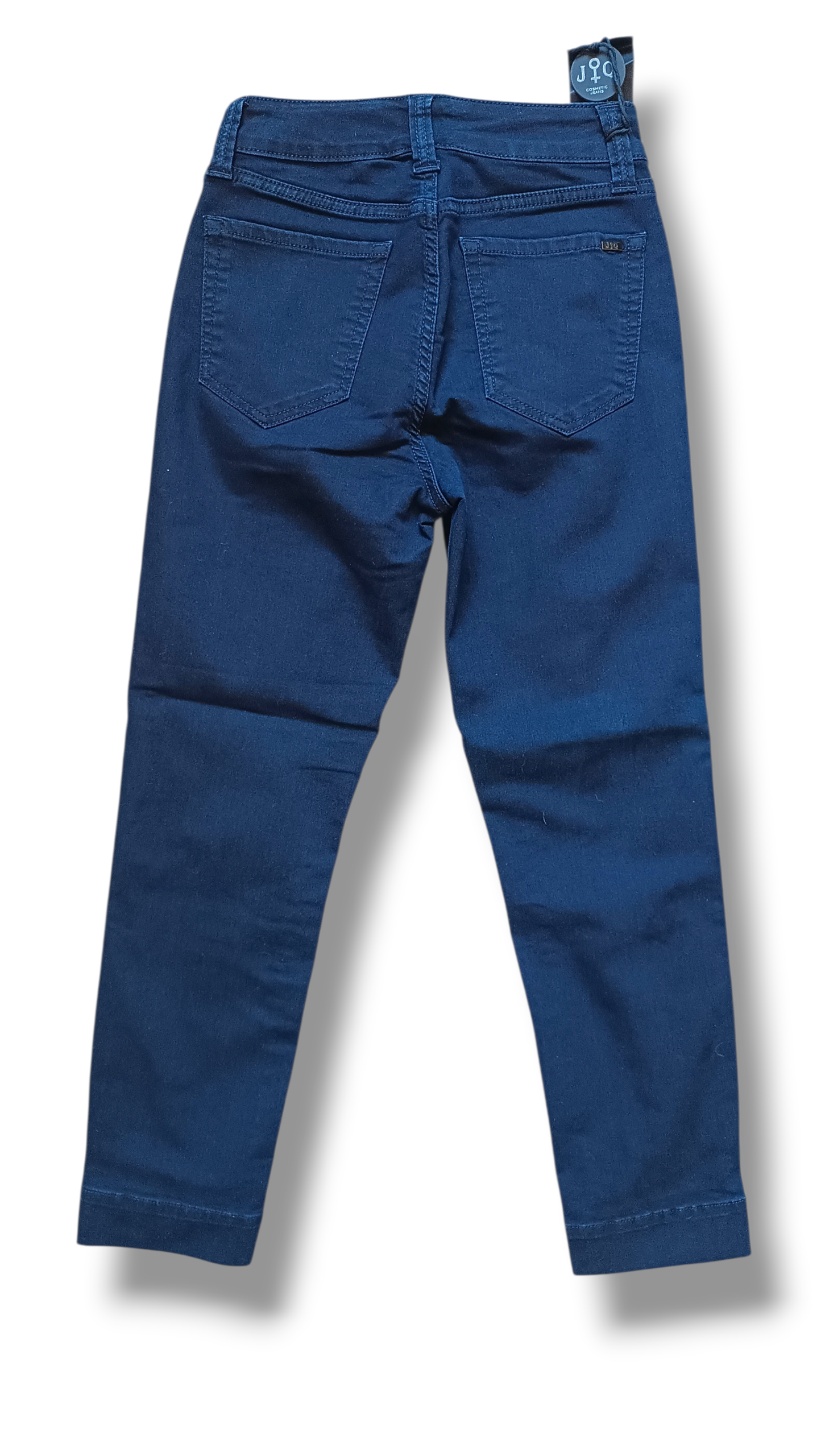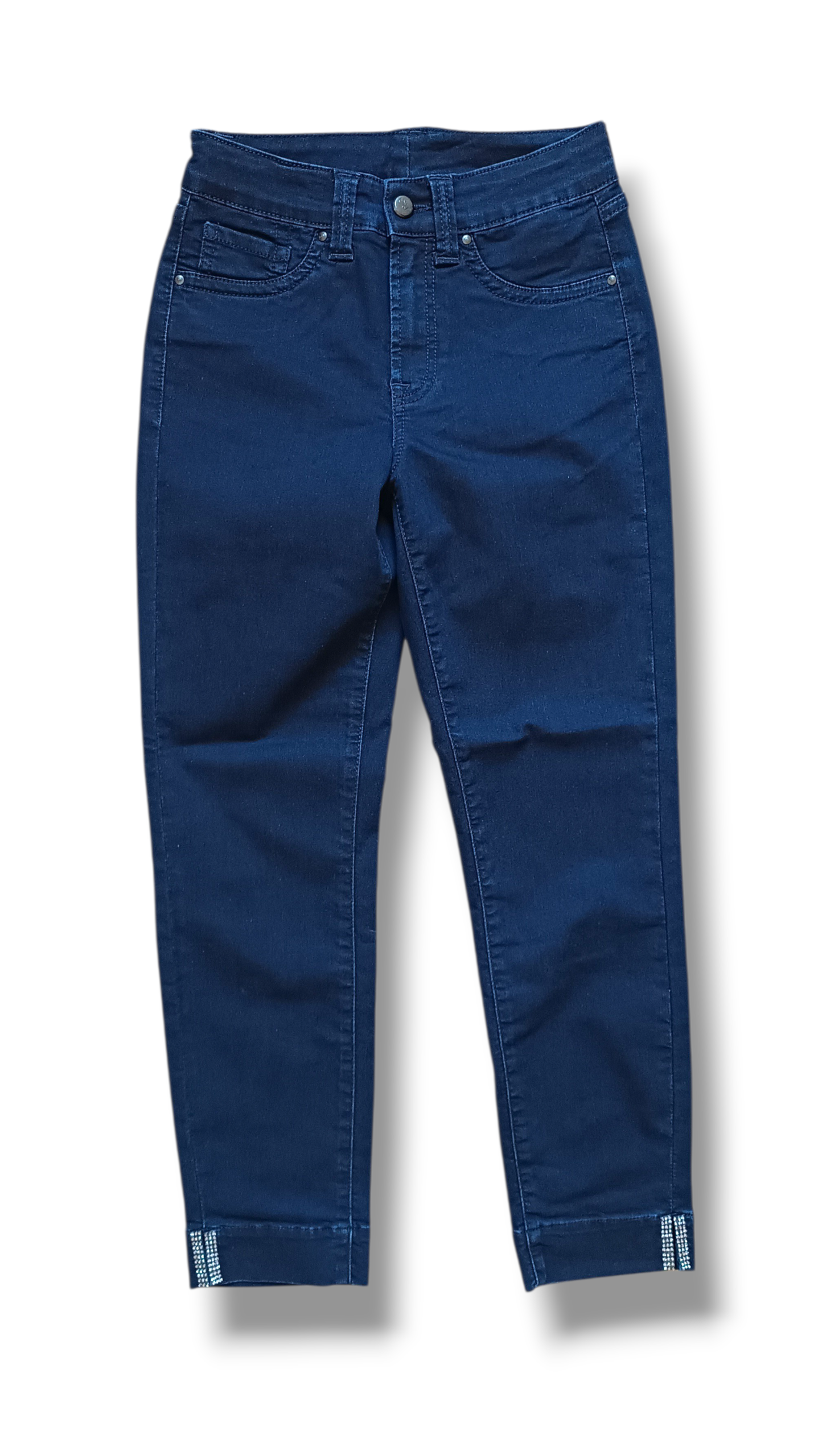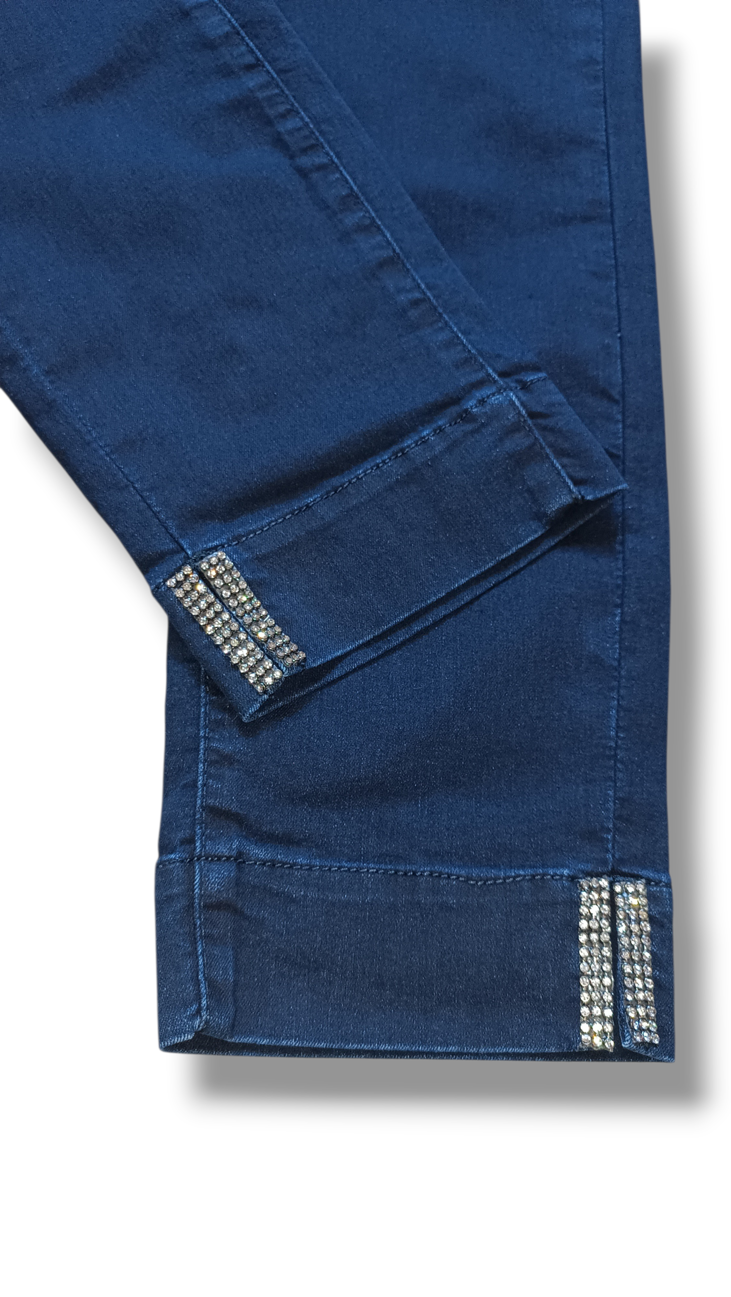 Pantalón vaquero JONNYQ en color azul marino, con detalle de strass en la parte baja que aporta un toque elegante y diferente. Su largo por encima del tobillo y su tejido cómodo lo convierten en una prenda ideal para looks actuales.
