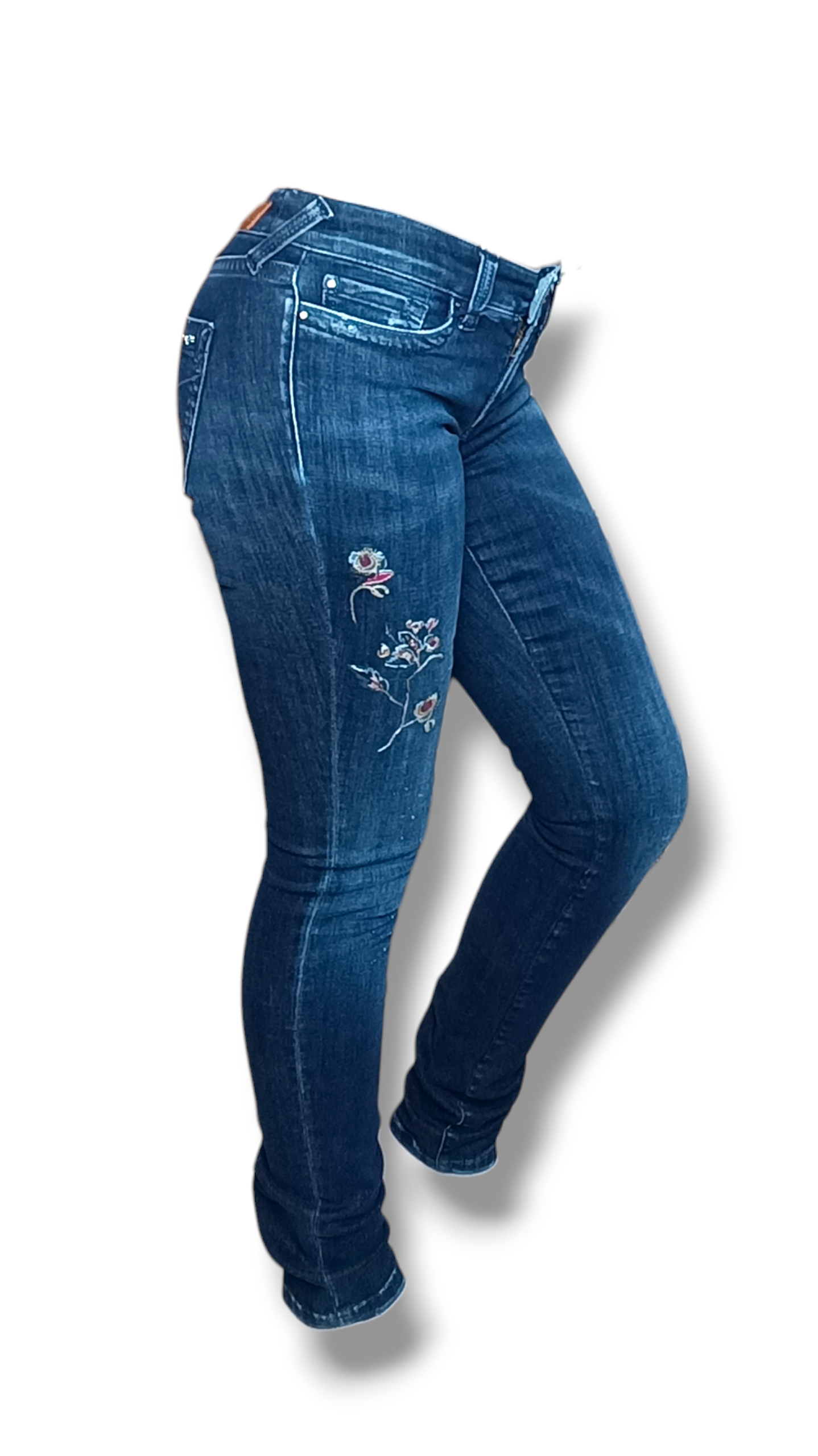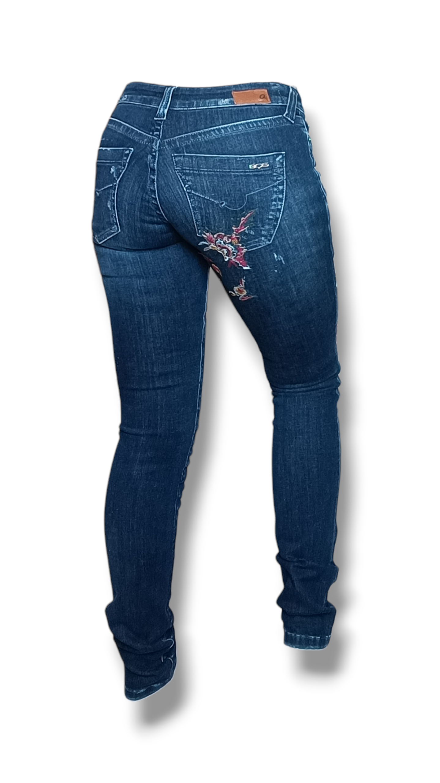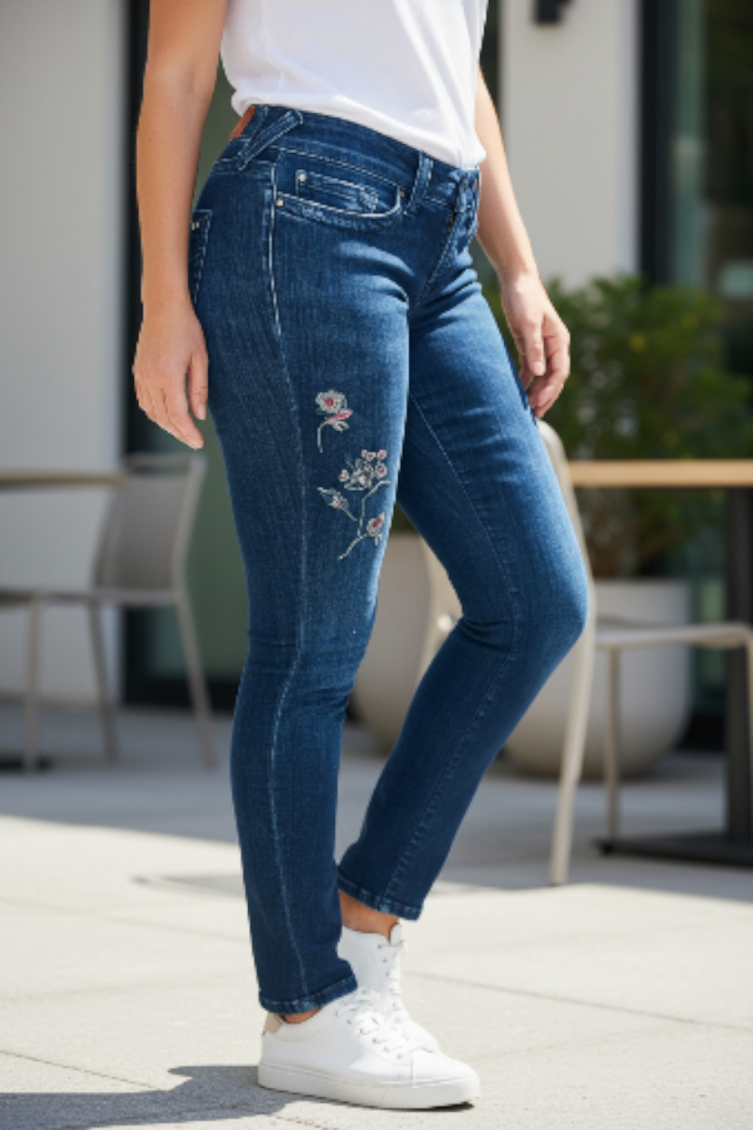 Un denim femenino, cómodo y con un toque artesanal. Este pantalón vaquero super stretch destaca por sus bordados florales en la pierna derecha delantera y en la parte trasera, aportando un estilo romántico y diferenciado sin perder comodidad. Su diseño clásico con cinco trabillas, cierre de botón y cremallera —incluyendo botón joya intercambiable con otro metálico— y sus cinco bolsillos, lo convierten en una prenda práctica, moderna y perfecta para uso diario.