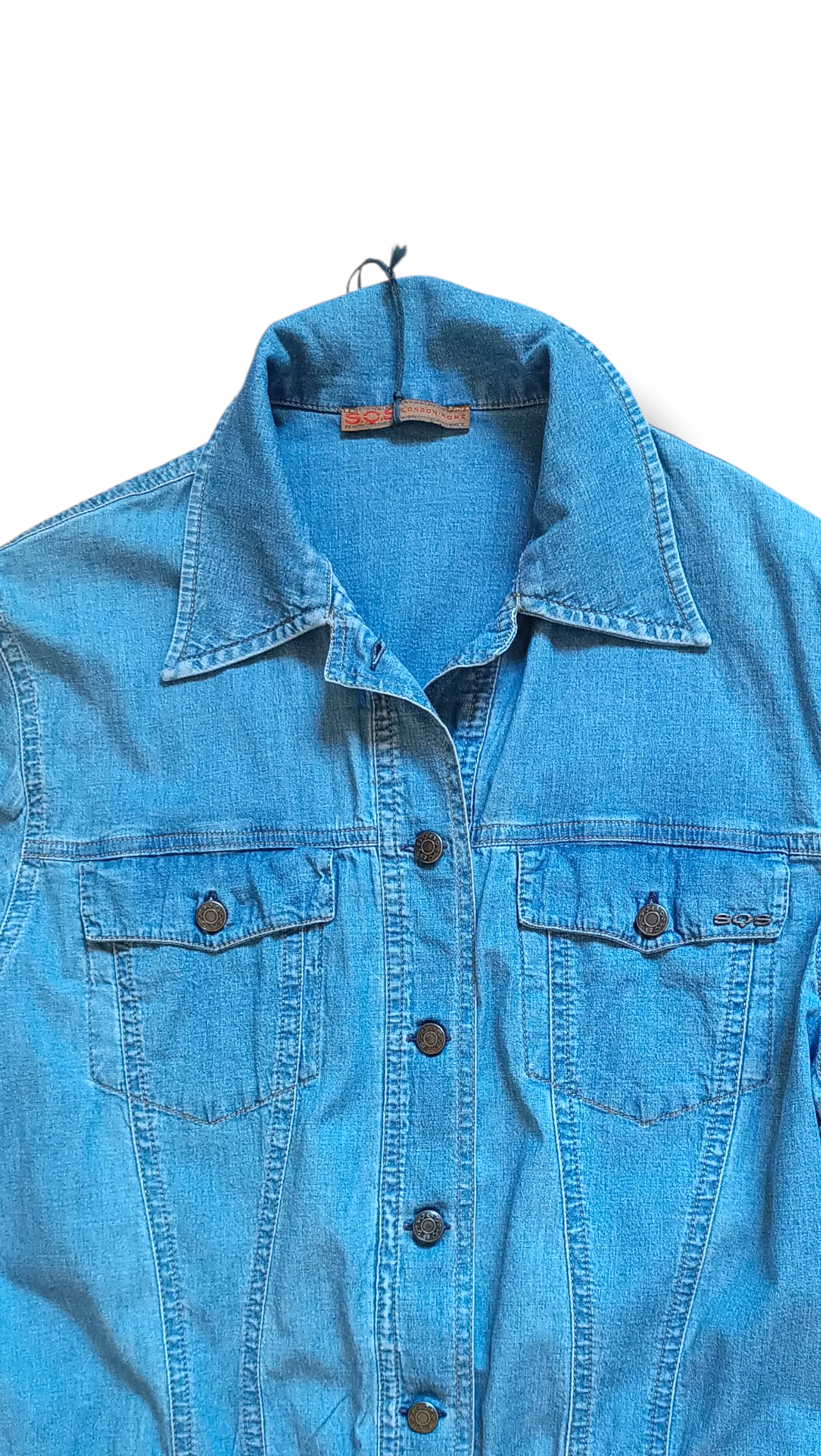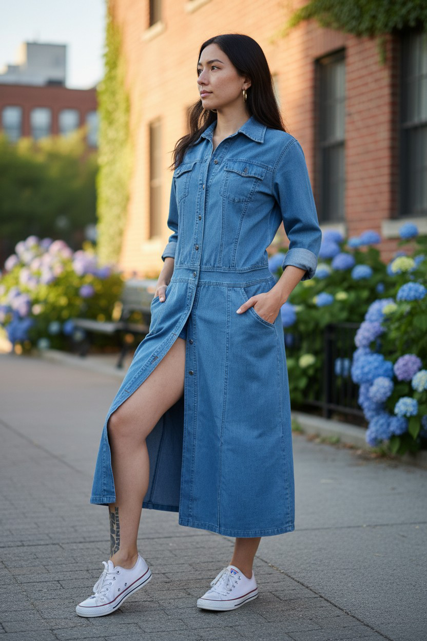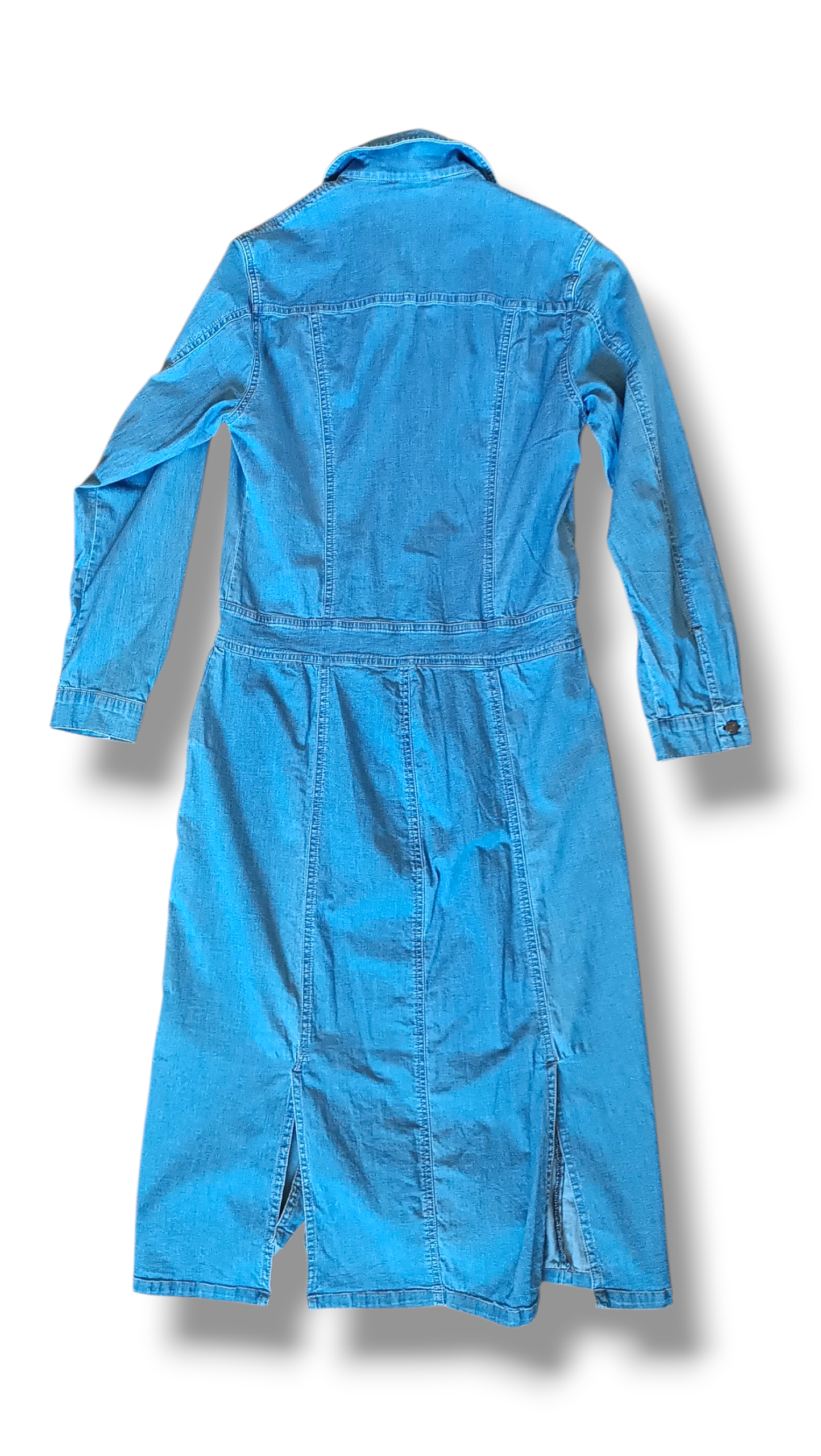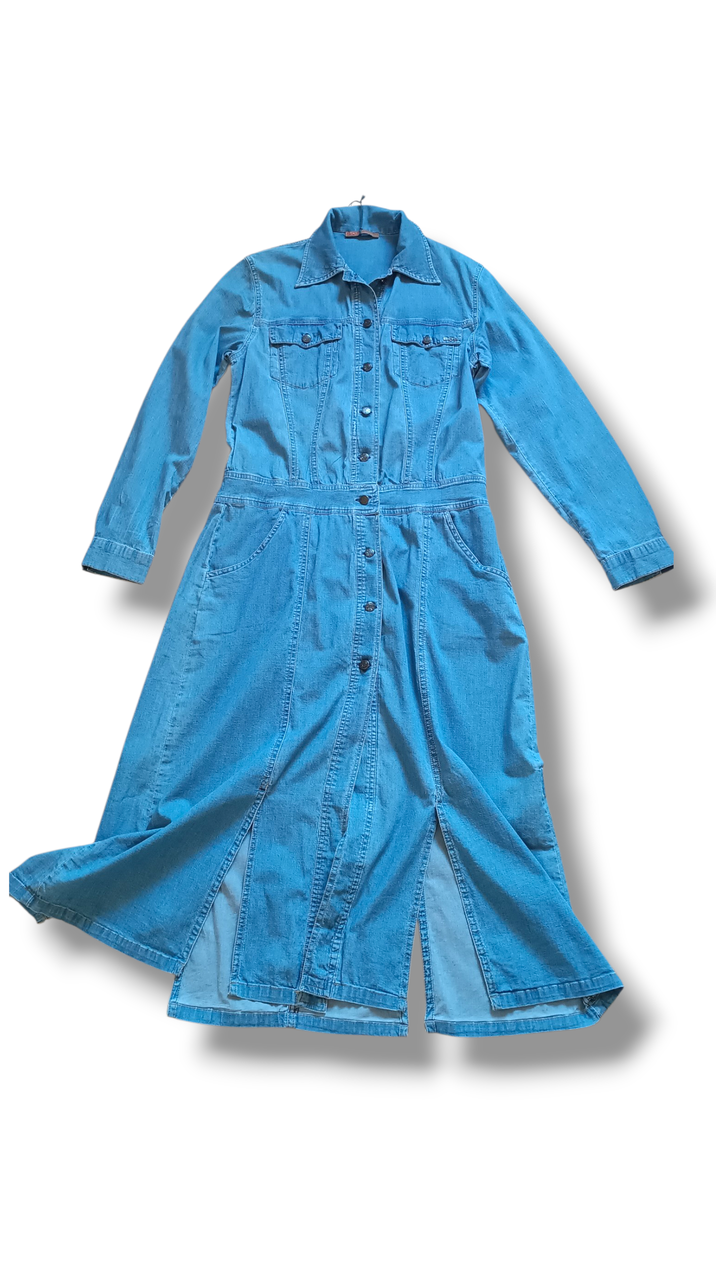 Vestido vaquero largo de SOS Jeans con diseño versátil y funcional, ideal para llevar como vestido o tipo gabardina abierta. Sus botones a lo largo y las aberturas delanteras y traseras aportan comodidad y movimiento, creando un look moderno y muy estiloso.