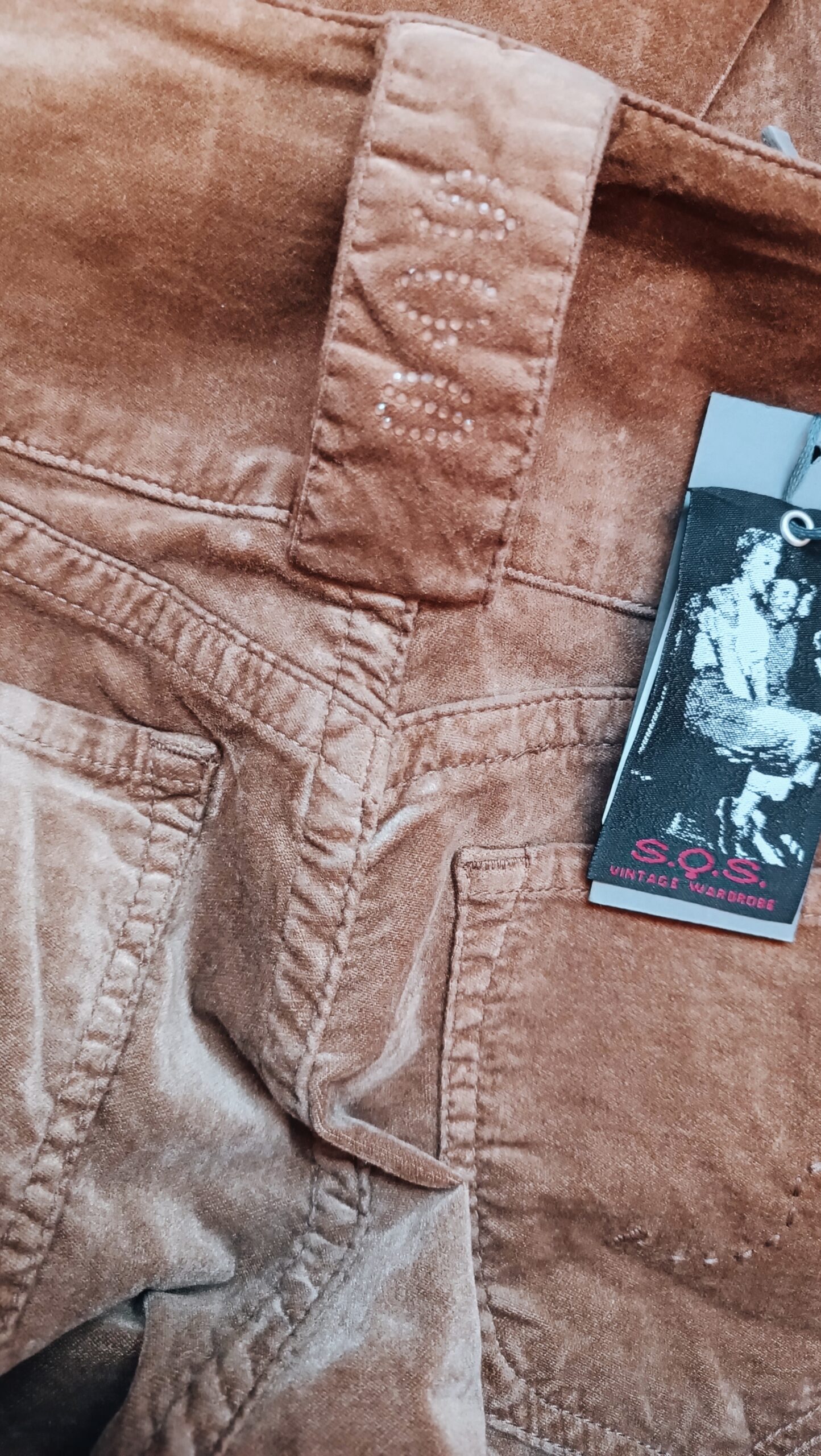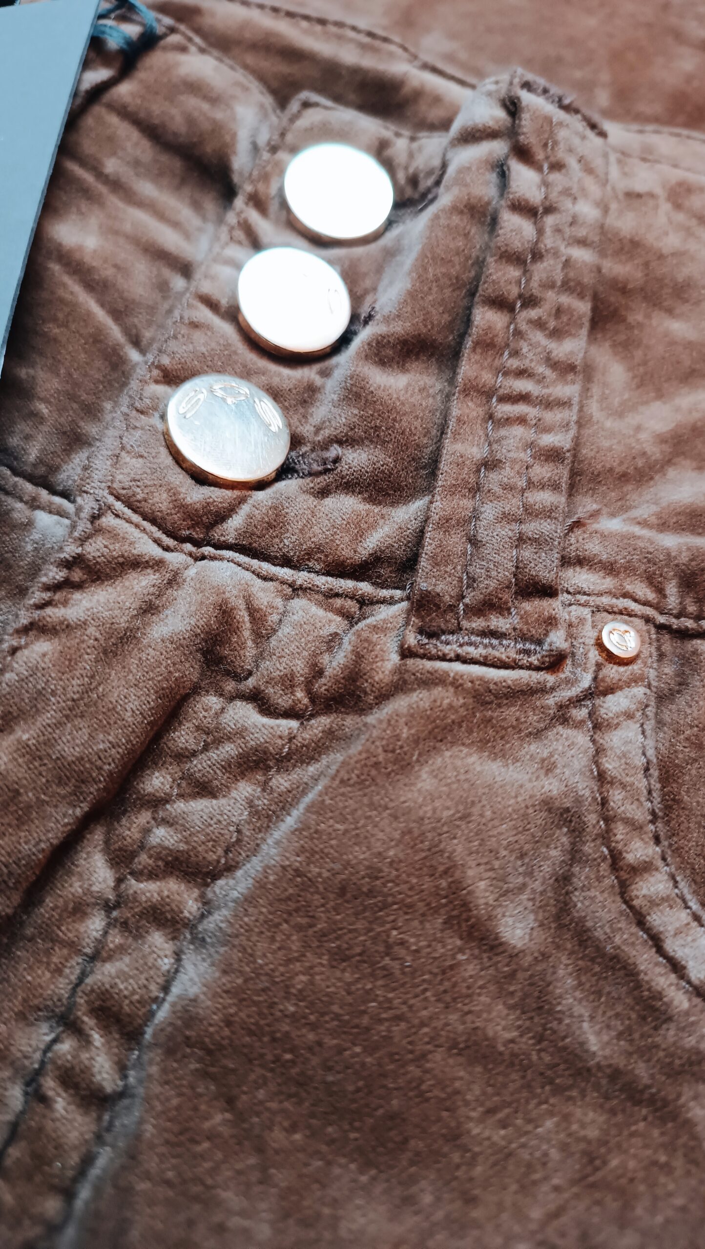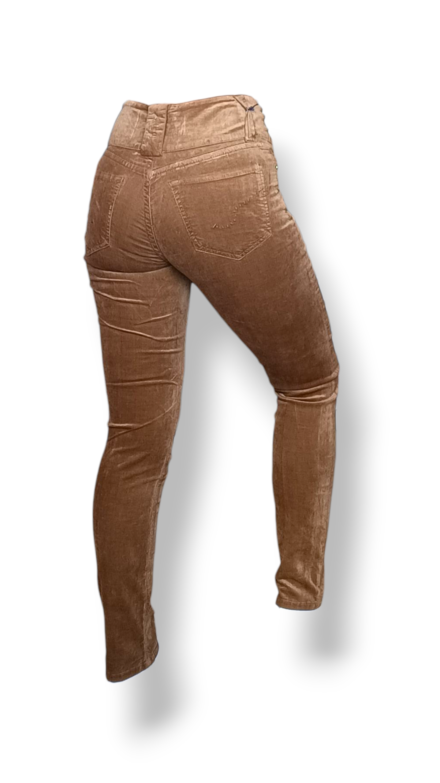 Pantalón stretch de cintura alta confeccionado en tejido velvet con un elegante acabado bronce que aporta luz y sofisticación. Presenta cierre con cremallera y tres botones metálicos dorados, 5 trabillas (una decorada con el logo SOS en strass) y cinco bolsillos funcionales.