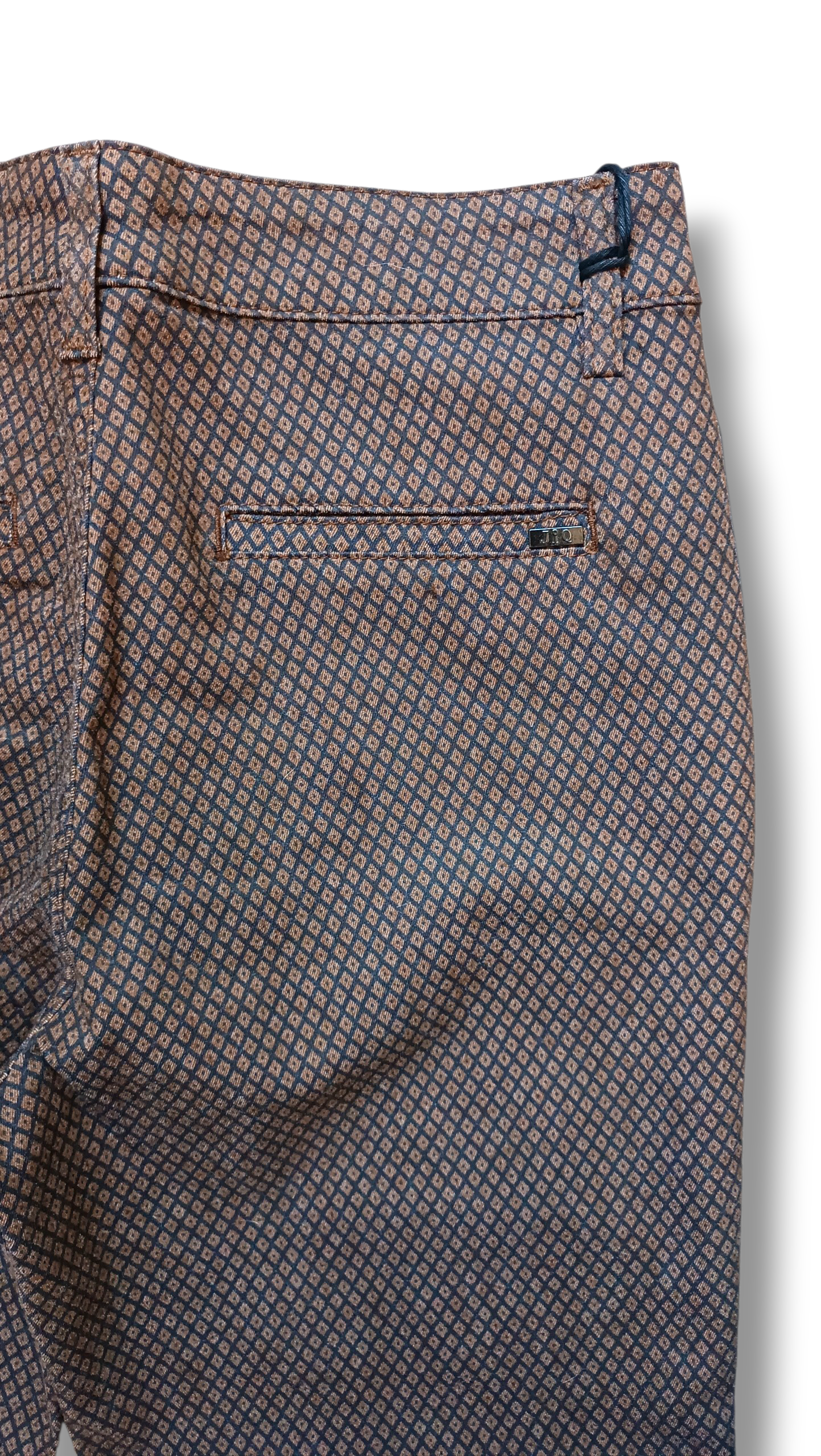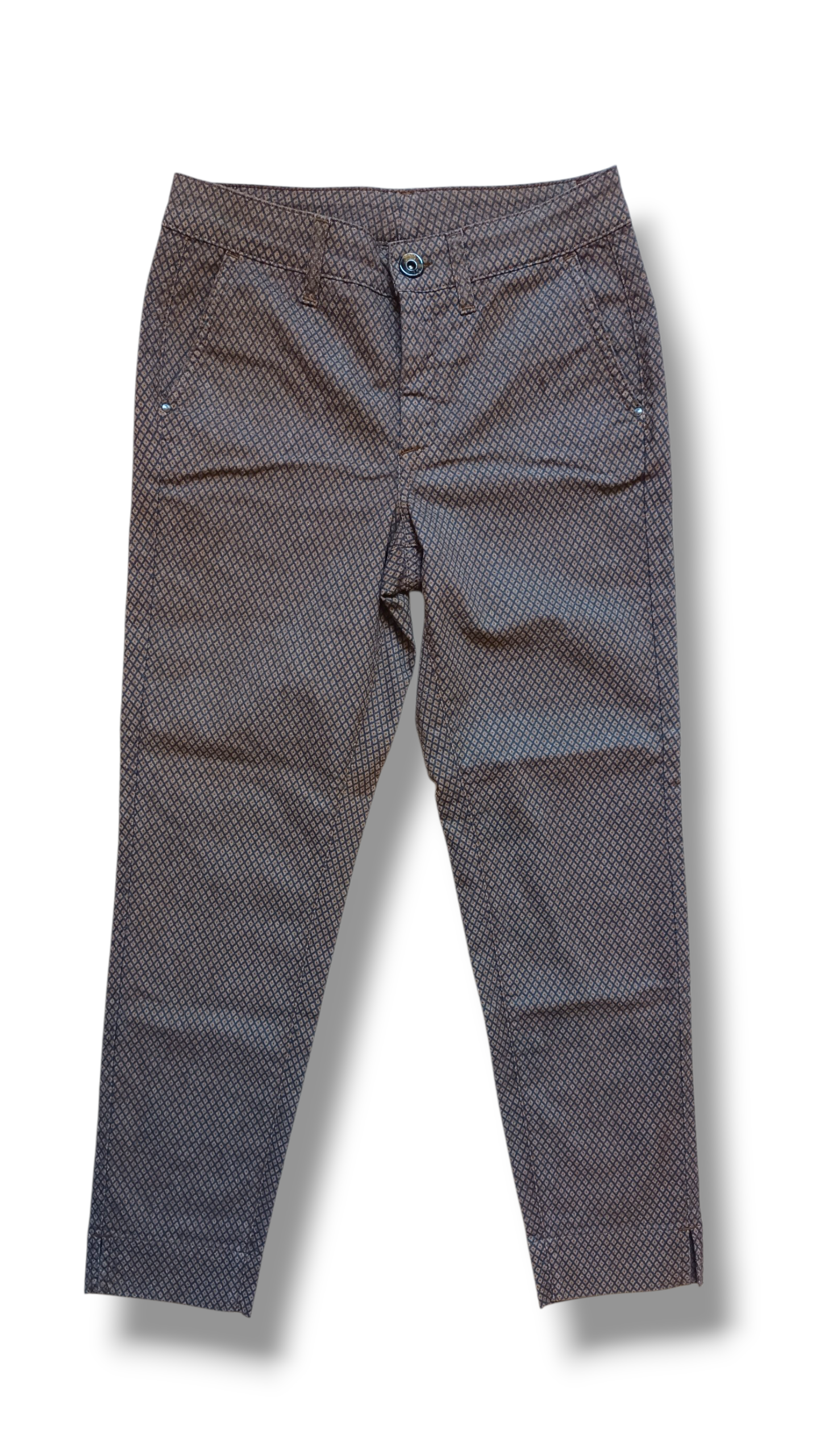 Pantalón chinos de la marca italiana JONNYQ confeccionado en tejido twill con estampado de micro rombos, un diseño elegante y original que aporta textura y personalidad al look. Su largo al tobillo y su color bronce lo convierten en una prenda sofisticada y muy versátil.