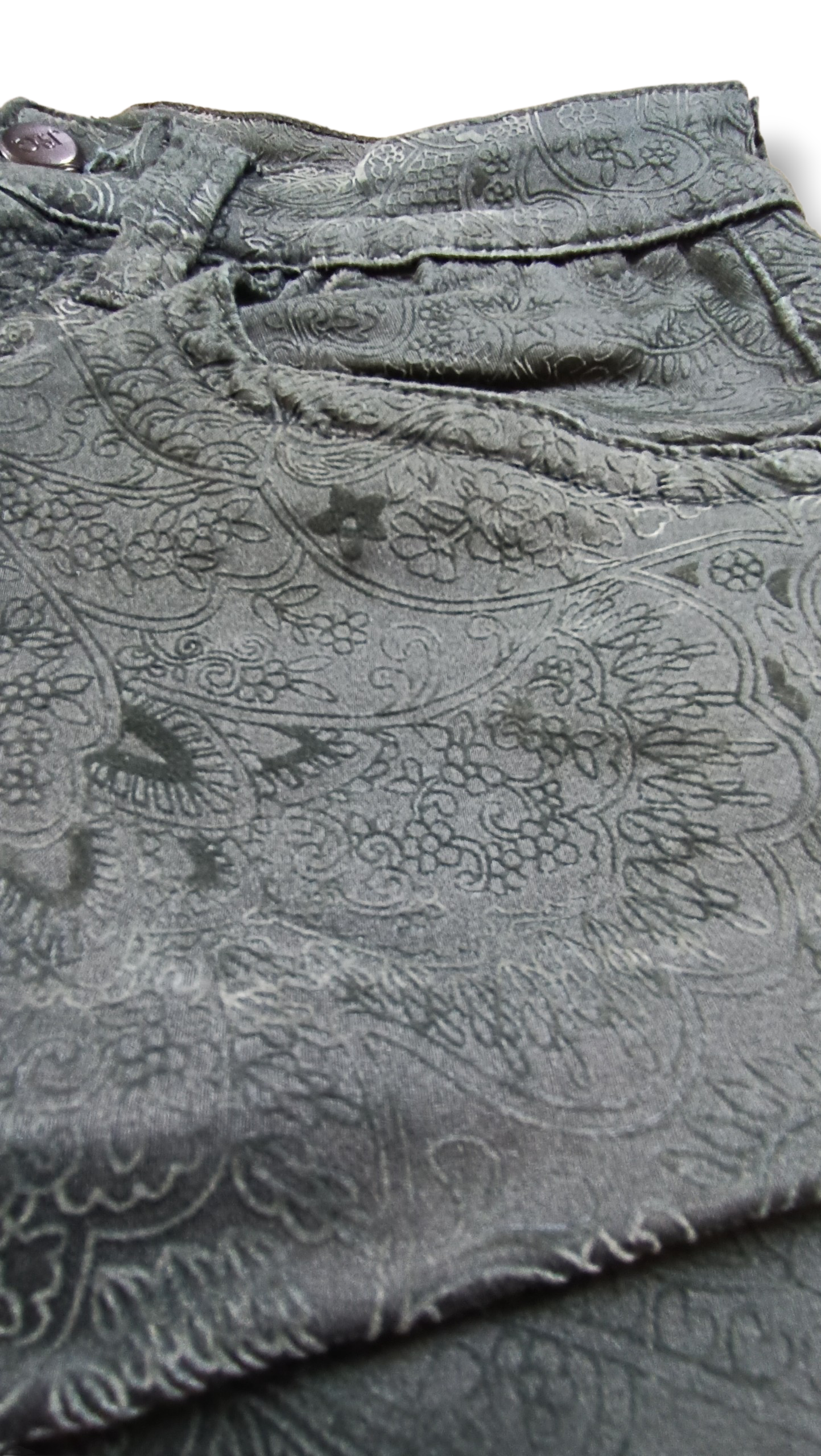 El pantalón de tejido flock con diseño cachemire de la marca italiana Jonny Q destaca por su estilo elegante y su textura con efecto relieve. Su color verde oliva aporta un toque sofisticado y versátil, ideal para crear looks con personalidad tanto en outfits casuales como más elegantes.