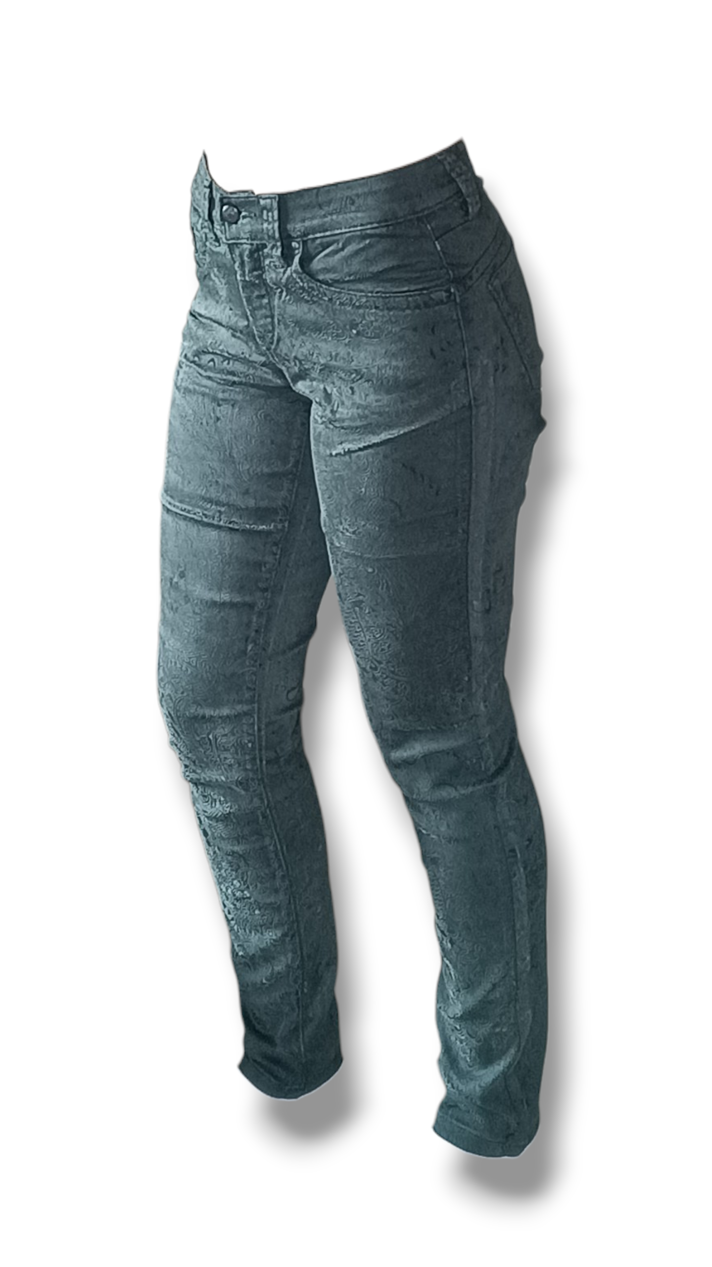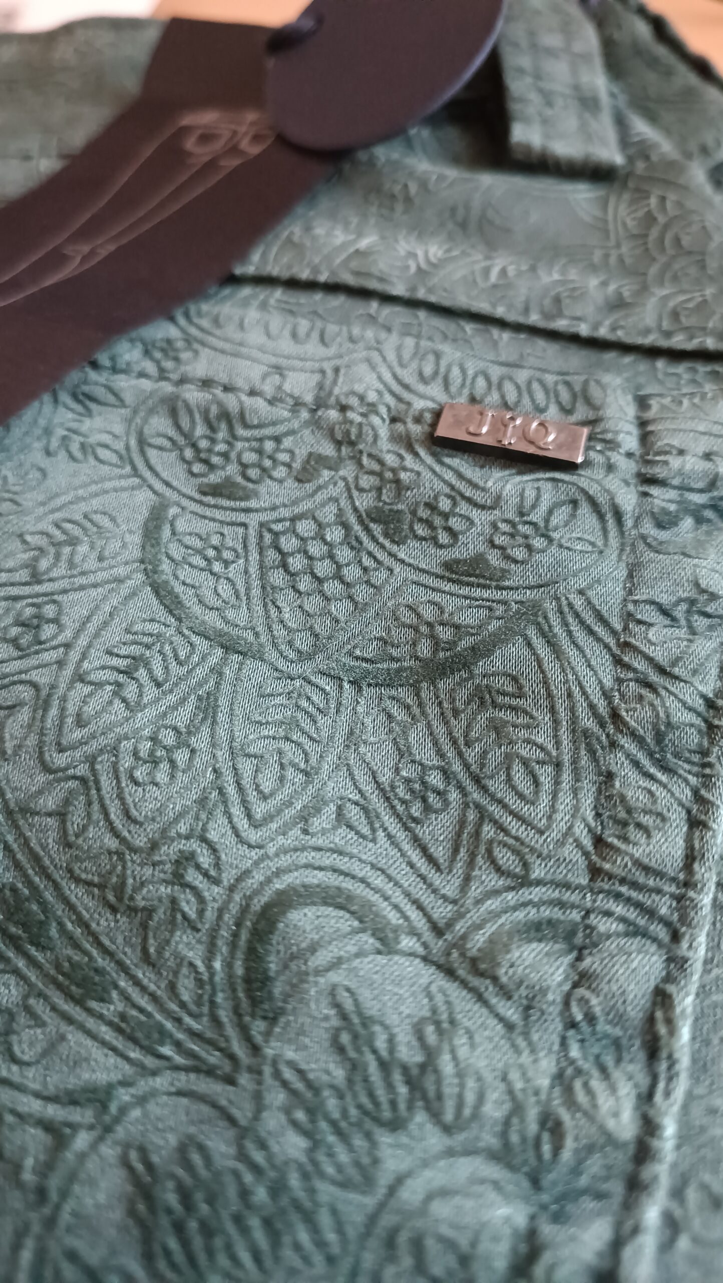Características del producto: Marca: Jonny Q (Italia), tipo: pantalón tejido flock cachemire, color: verde oliva, textura: tejido con efecto relieve, cierre: botón y cremallera, 5 trabillas para cinturón, bolsillos: 3 delanteros y 2 traseros, composición: 67% algodón, 30% poliéster, 3% elastano.