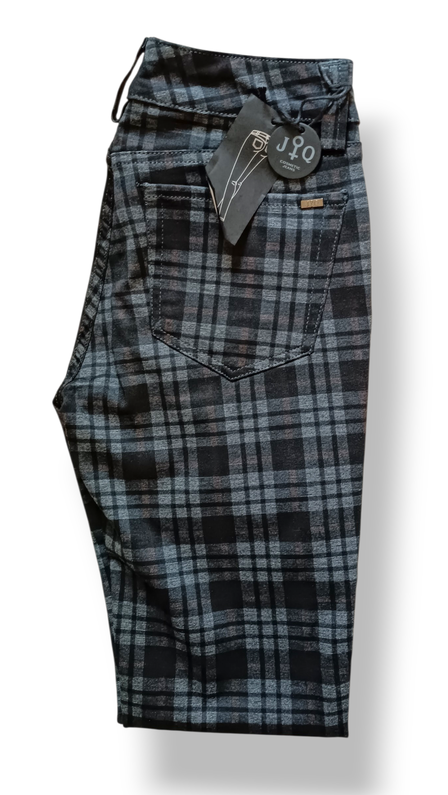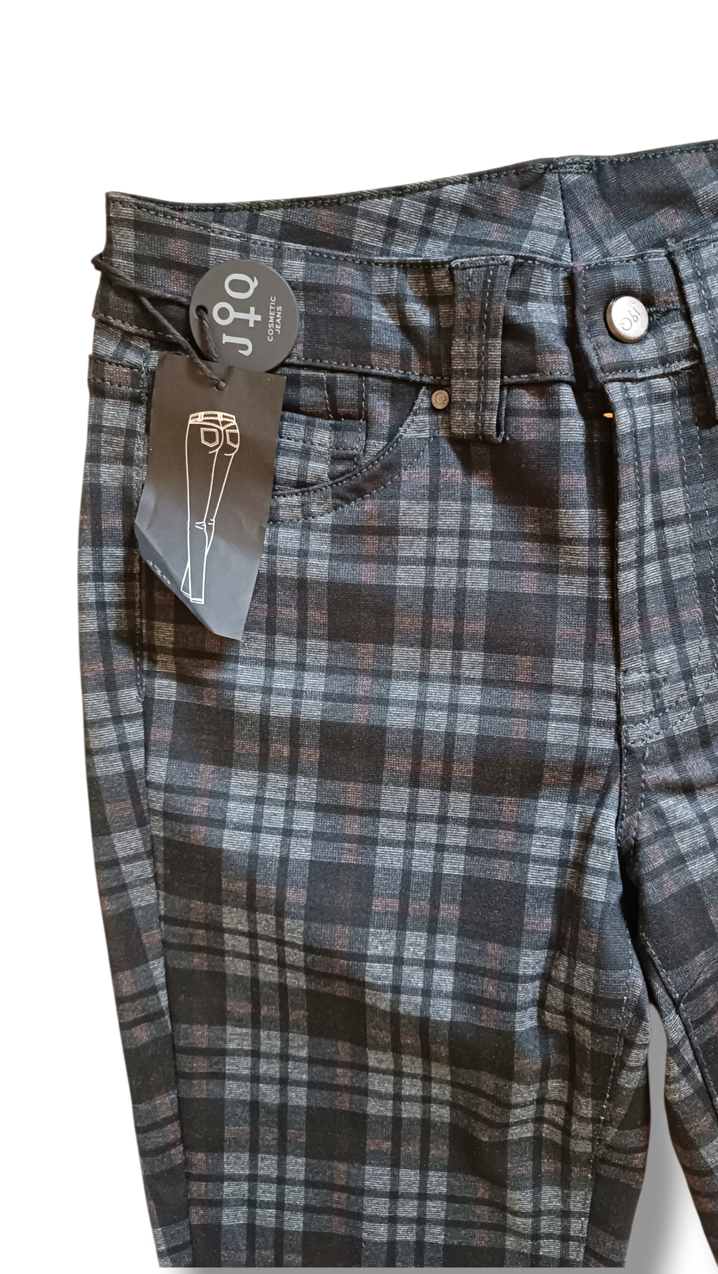 Características del producto: Marca: Jonny Q (Italia), tipo: pantalón de cuadros estilo tartán, colores: marrón y negro, modelo: stretch cómodo, largo de pierna: regular, cierre: botón y cremallera, 5 trabillas para cinturón, bolsillos: 3 delanteros y 2 traseros, composición: 55% poliéster, 45% viscosa, 4,5% elastómero.
