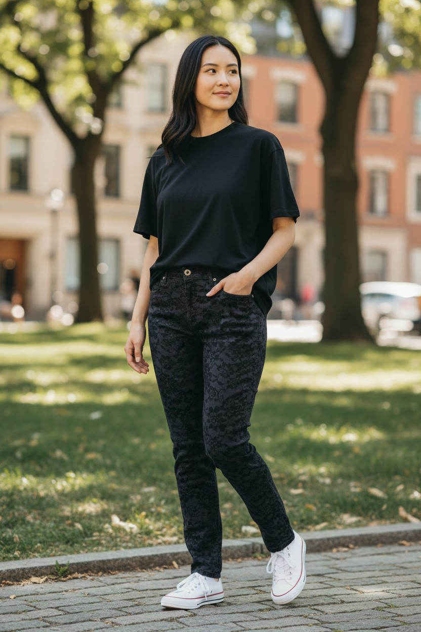 - Para un outfit casual, añade camiseta básica y zapatillas.