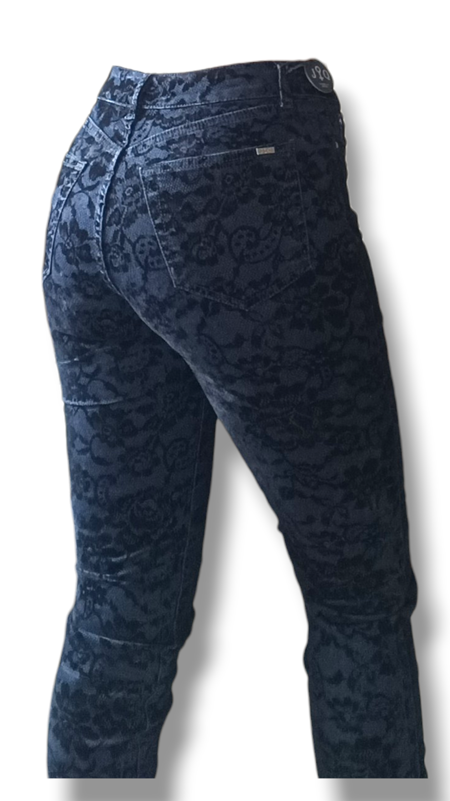 Características del producto: Marca: Jonny Q (Italia), tipo: pantalón invernal flock, color: denim blue, efecto: textura con diseño tipo encaje, cierre: botón y cremallera, 5 trabillas para cinturón, bolsillos: 3 delanteros y 2 traseros, composición: 67% algodón, 30% poliéster, 3% elastano.